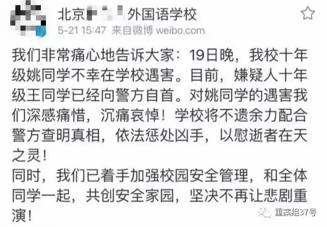 2016年5月20日下午,有网友爆料称昌平某外国语学校,一名女生在教室内被男同学杀害。昌平警方随后确认该学校内一女生在教室内死亡,后该校男生王某(17岁,本市人)向警方投案。