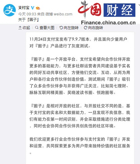 支付宝官方微博称,“圈子”是一个开放平台,支付宝希望向合作伙伴开放更多的基础能力,与更多社群运营者共同建设基于实名的同好互动共享社区,方便他们交流、互动、从而为用户和各行业合作伙伴创造价值。