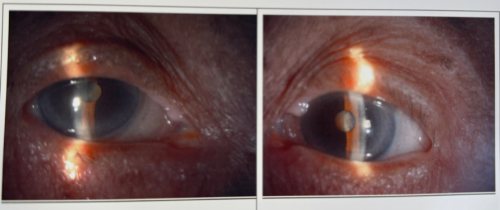 视力与瞳孔数据:术前右眼视力仅为0.06(标准视力表第一行都难以看清),左眼仅能辨认眼前30厘米处的手指。裂隙灯检查显示,其双眼瞳孔因虹膜粘连,直径仅约2毫米(约一粒绿豆大小),且散瞳药水无法使其扩大,这为手术建立了一个异常狭窄且固定的操作通道。