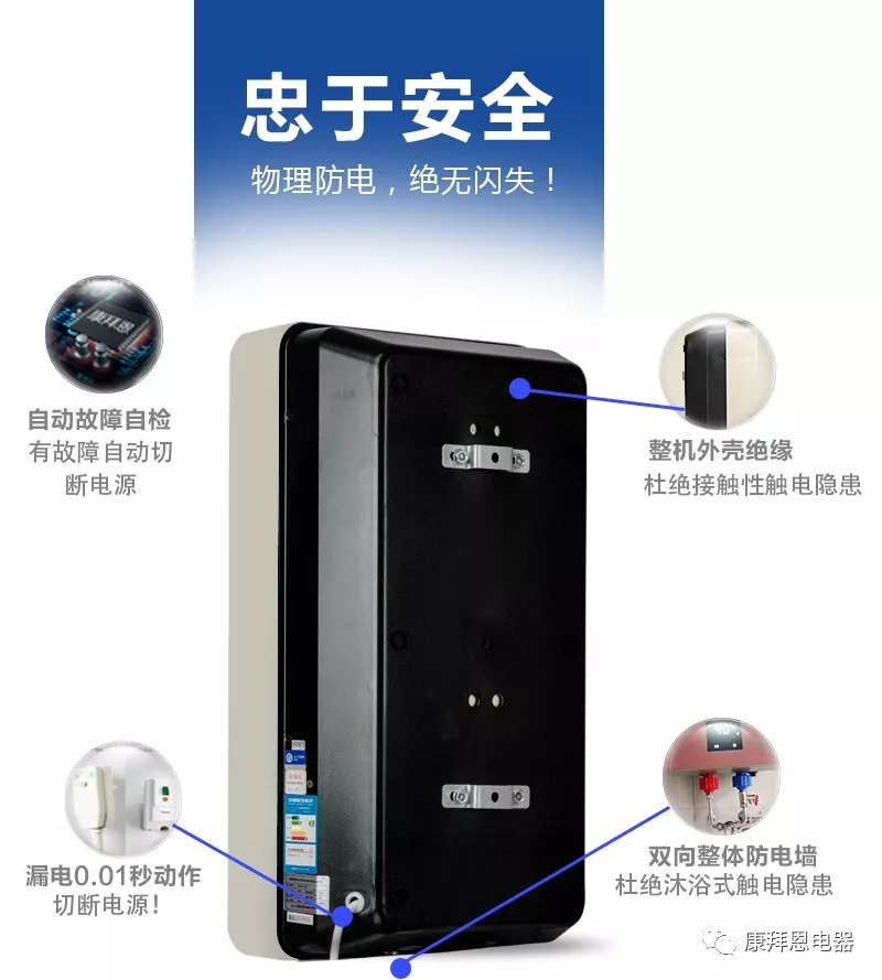 艾家在行业内首先倡导物理性防漏电措施,以整机外壳绝缘方式,杜绝电热水器接触式触电隐患;以出水口采用双向整体防电墙设计,解决了电热水器沐浴式触电隐患。永不失效,绝对安全。